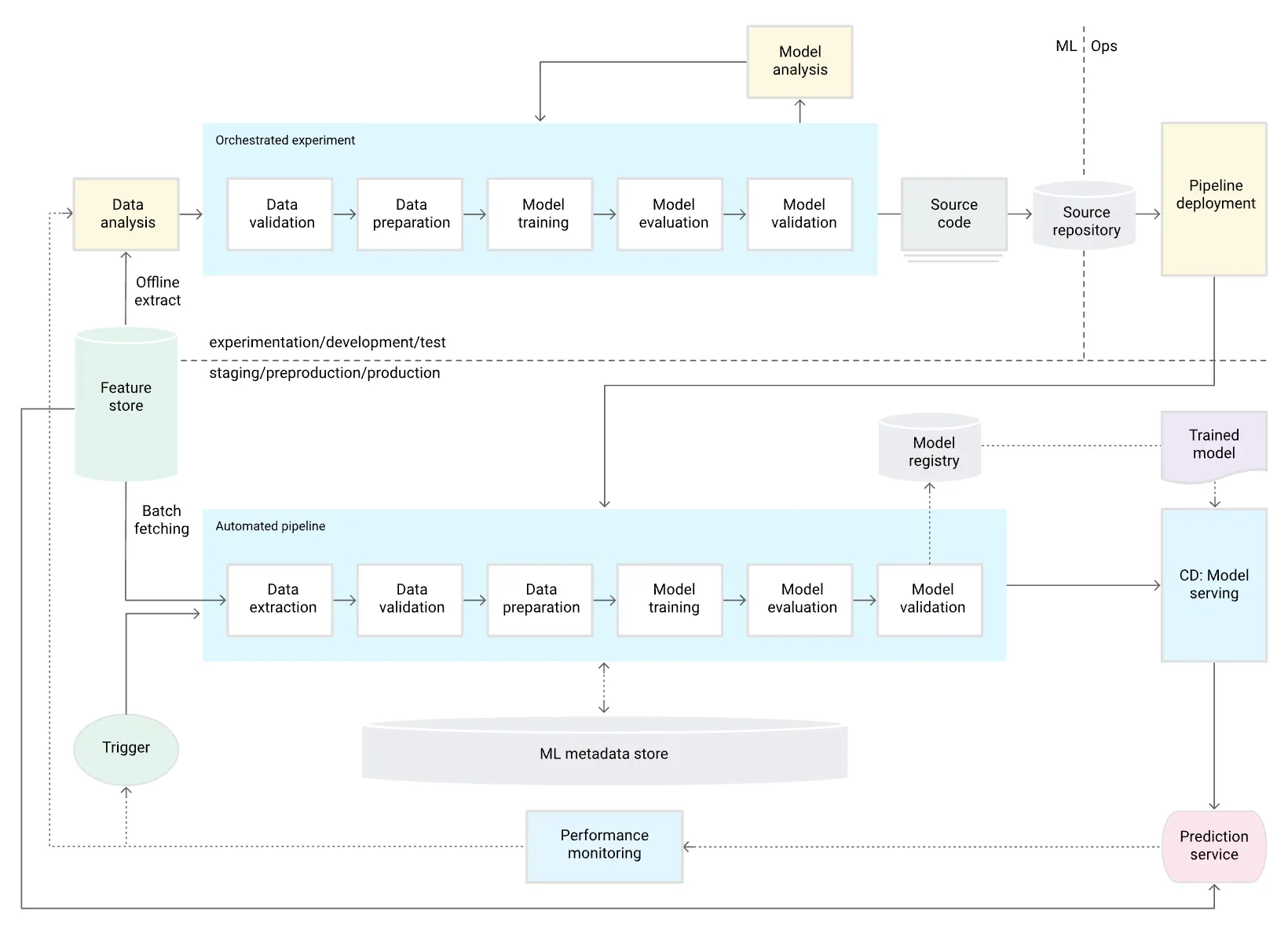 MLOps는 머신 러닝 작업(Machine Learning Operations)을 뜻합니다. 구글의 자료(MLOps: Continuous delivery and automation pipelines in machine learning)에 따르면, ML시스템 개발(Dev)과 ML 시스템 운영(Ops)을 통합하는 것을 목표로하는 ML 엔지니어링 문화 및 방식으로 정의를 내리고 있습니다. 따라서, MLOps는 데이터 수집단계 부터 시작해 ML 모델을 학습하고 실제 서비스에 배포하는 단계까지 전 과정을 AI Lifecycle로 보고, MLOps의 대상으로 불 수 있습니다.