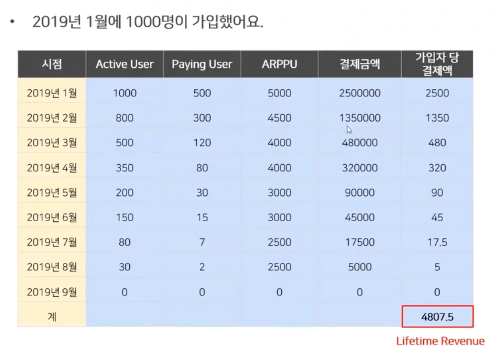 근데 이 유저가 안나가고 계속 남아서, 매년 4000원씩 매출을 일으킨다면??? → 음 긴가민가